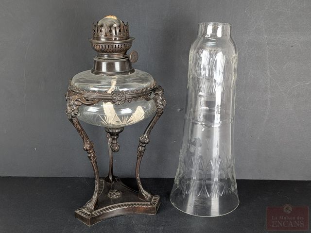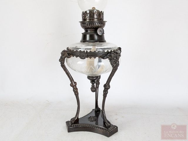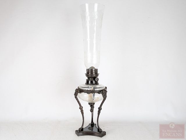 Lot # 176 - Lampe à l'huile en bronze et verre ciselé avec motifs de gargouilles, mesurant 23 pouces de hauteur SOLD