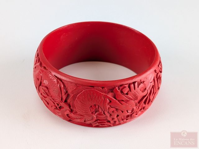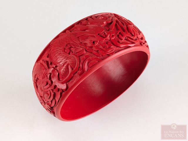 Lot # 186 - Bracelet chinois sculpté sur cinnabre avec motif de dragon, mesurant 3.25 pouces de largeur SOLD