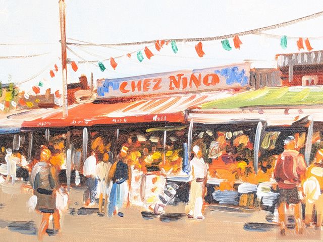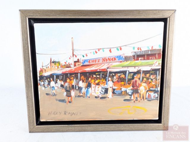 Terry TOMALTY- Huile sur toile signée, mesurant 8x10 pouces et titrée Jean-Talon Market Chez Nino, avec étiquette de la galerie Kastel