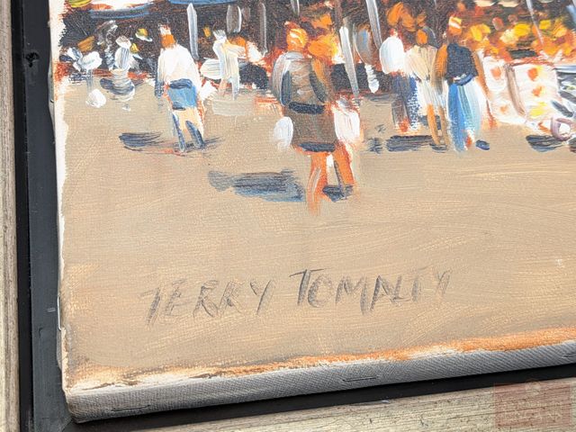 Lot # 161 - Terry TOMALTY- Huile sur toile signée, mesurant 8x10 pouces et titrée Jean-Talon Market Chez Nino, avec étiquette de la galerie Kastel