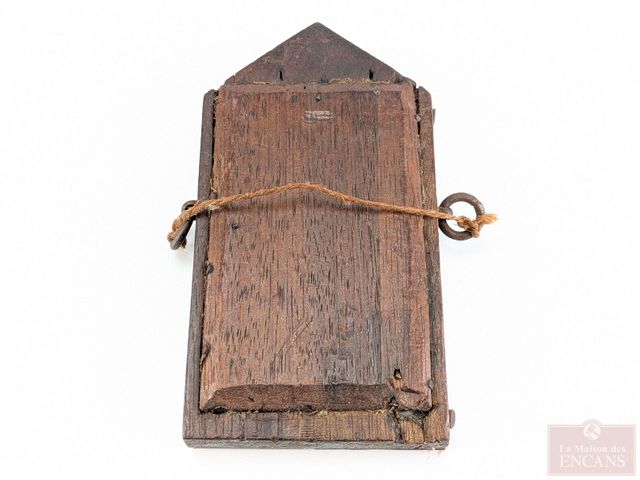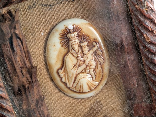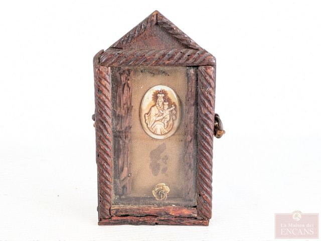 Lot # 74 - Ancienne icône religieuse représentant la vierge, avec rose en or, dans un joli encadrement en bois sculpté et verre, datant du 19eme siècle et mesurant 6x3.5 pouces