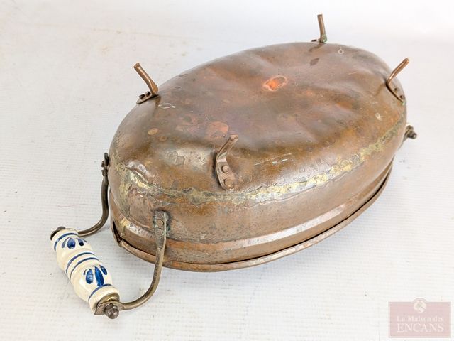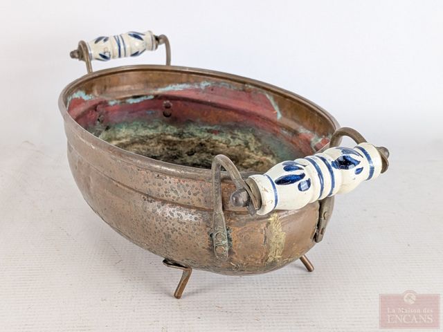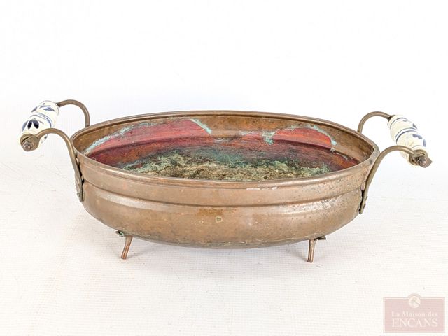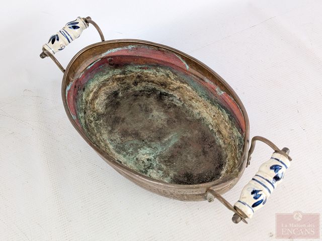 Lot # 4 - Centre de table en cuivre avec poignées en céramique, peint à la main et mesurant 15 pouces
