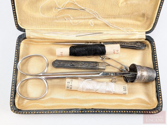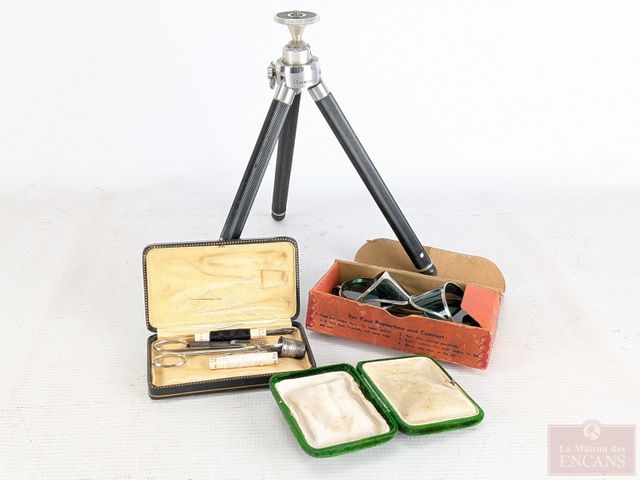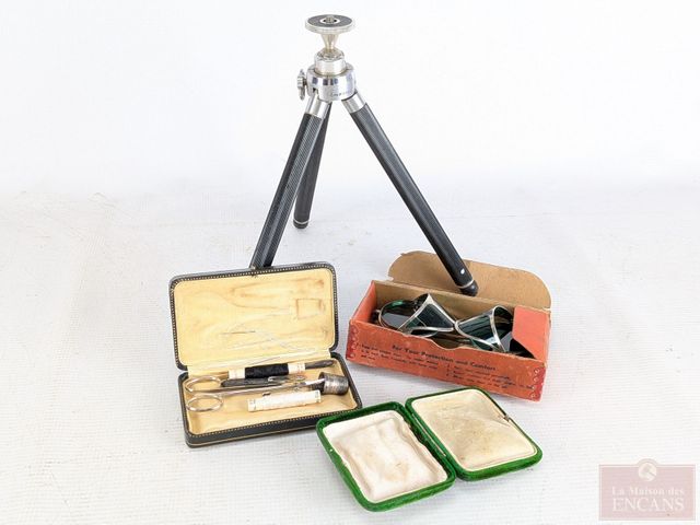 Lot # 25 - Lot varié comprenant ensemble de couture, dont manches et dé à coudre en argent, trépied allemand vintage Esilg, paire de lunettes à soudure vintages Willson, dans sa boite d'origine et autre