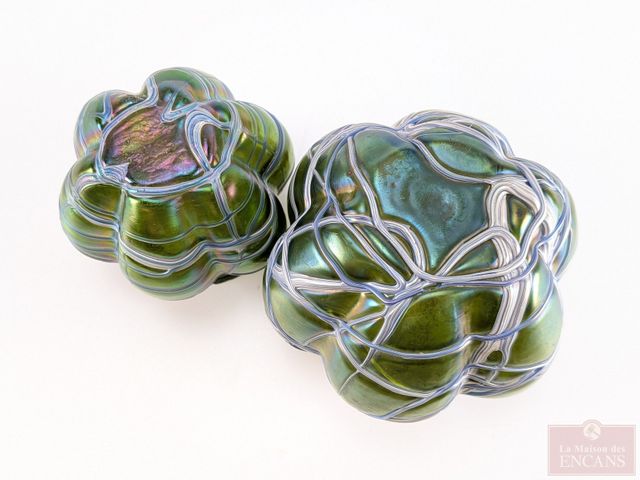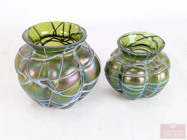 Deux vases en verre iridescent Loetz, circa 1900, le plus grand mesurant 4.25 pouces de hauteur (petites ébréchures)
