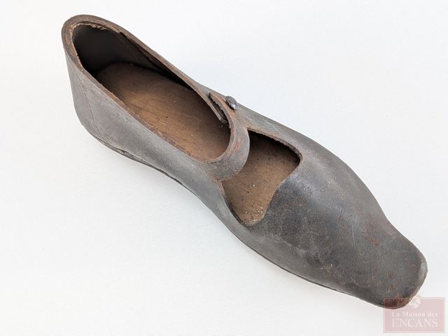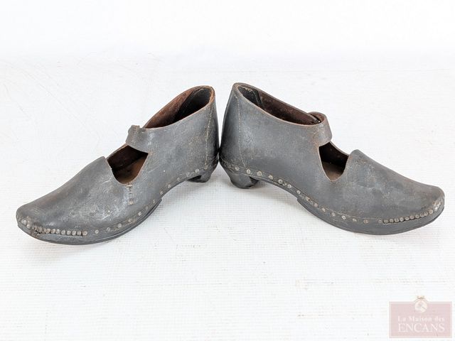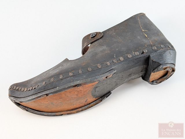 Lot # 135 - Ancienne paire de chaussures d'équitation en cuir avec semelles de bois et fer forgé, datant du 19eme siècle et mesurant 9.25 pouces de longueur