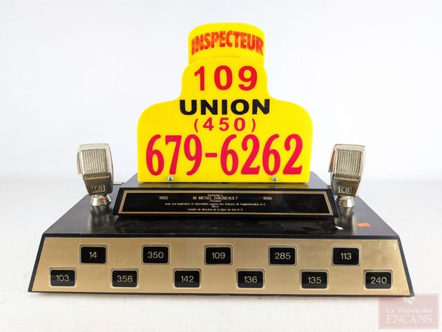 Trophée lumineux Taxi Union offert à Michel Daigneault, président du comité de direction de la ligue de taxis A-2, datant de 1996 et mesurant 23 pouces