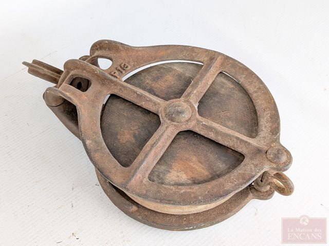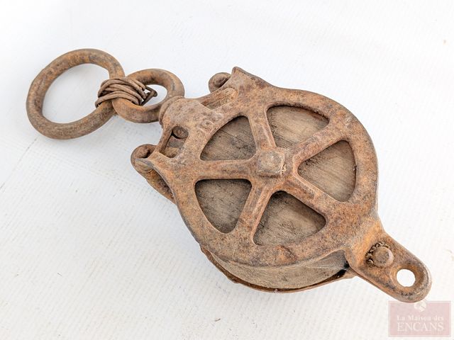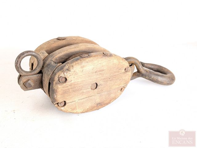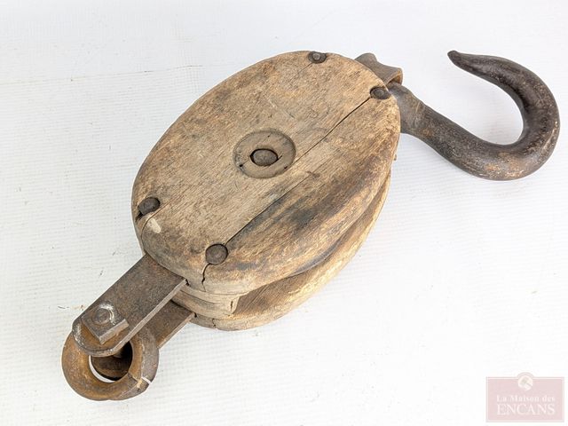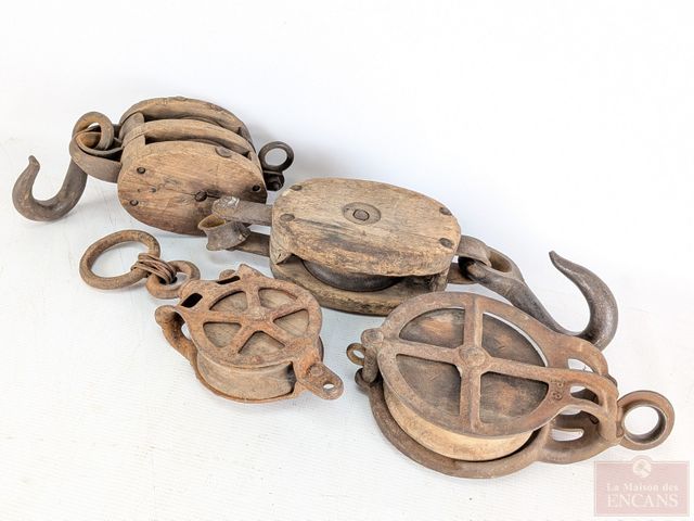 Lot d'anciens crochets et poulies industriels en bois et fer forgé, le plus grand mesurant 18 pouces de hauteur