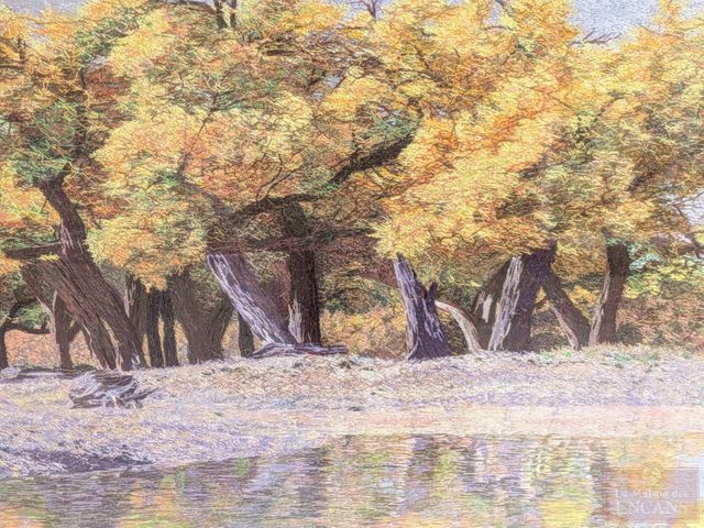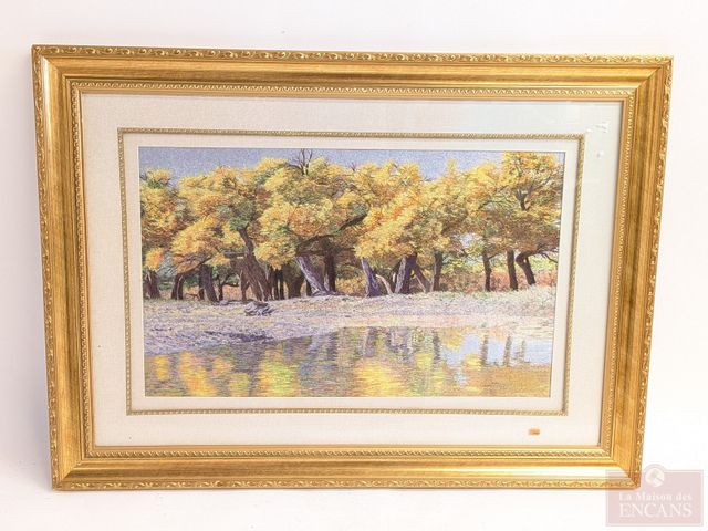 Lot # 141 - Exceptionnel travail à l'éguille en soie, entièrement fait à la main et mesurant 18x30 pouces, dans un joli encadrement doré mesurant 31x43 pouces, détails très fins