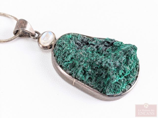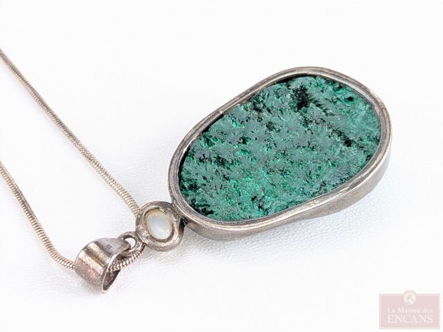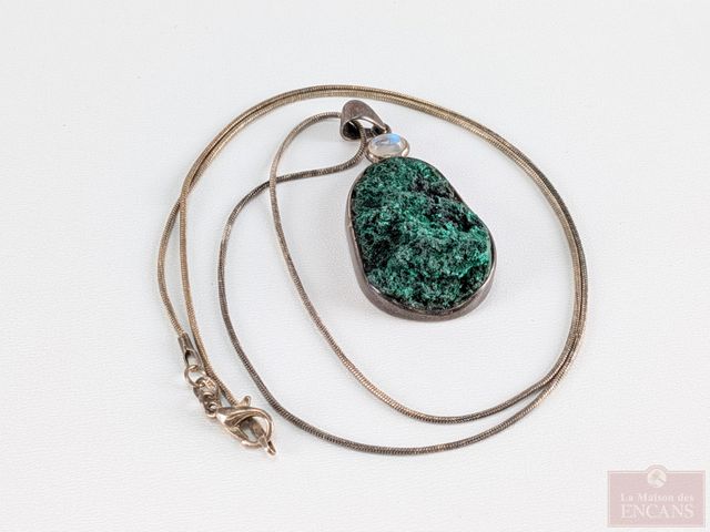 Lot # 84 - Chaine et pendentif en argent serti d'une labradorite et d'une malachite fibreuse, la chaine mesurant 23.5 pouces de longueur et le pendentif mesurant 2 pouces de hauteur