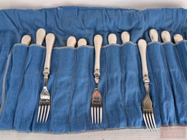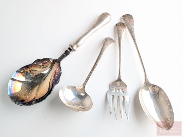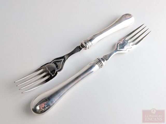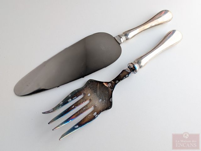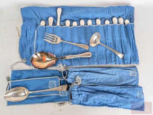 Lot # 99 - Ensemble de coutellerie Birks avec manches en argent sterling, ainsi que fourchette à poisson et cuillères en argent sterling, la plus grande cuillère mesurant 8.5 pouces
