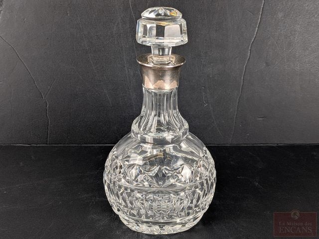 Carafe en cristal avec éléments en argent sterling Birks, mesurant 10 pouces de hauteur