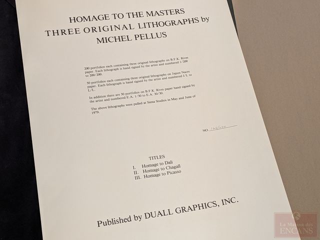 Michel PELLUS- Trois lithographies signées et numérotées Hommage aux maitres Dali, Chagall et Picasso, mesurant 19x19 pouces chacune, avec certificat