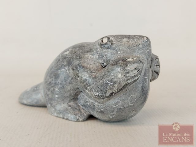 Deux sculptures inuites sculptées sur pierre à savon signées - la plus grande mesurant 5 pouces de hauteur