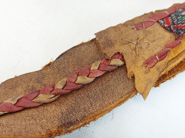 Remarquable et très longue ceinture 102 pouces en cuir de caribou et tissu avec des couleurs encore très vives pour l'âge et des motifs typiquement autochtones hurons-wendats en superbe condition et de très haute qualité