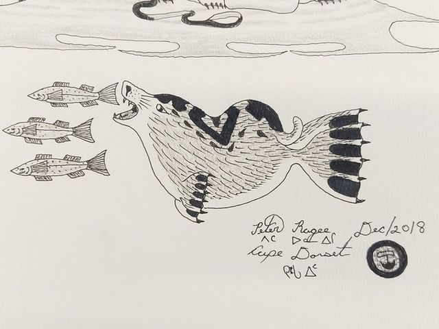 Lot # 135 - Magnifique dessin avec des très fins détails représentant un joueur de tambour avec son chien à ses côtés sur la glace et dessous un phoque chassant des poissons - à l'intérieur du tambour on distingue un rêve de l'esquimau signé en esquimau par l'artiste de très grande renommée Peter Ragee du Cap Dorset avec son sceau d'authenticité le Ulu - mesurant 22x15 pouces - en excellente condition et provenant d'une collection privée VENDU