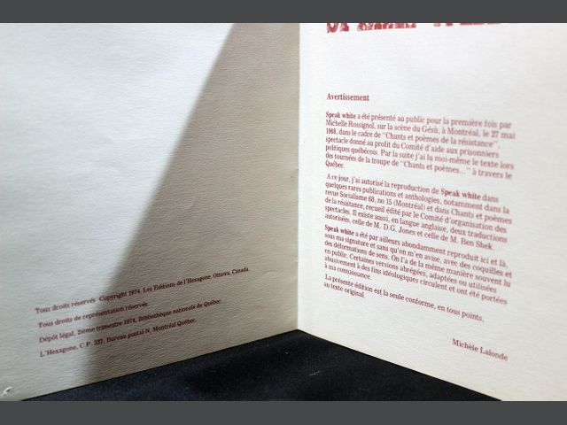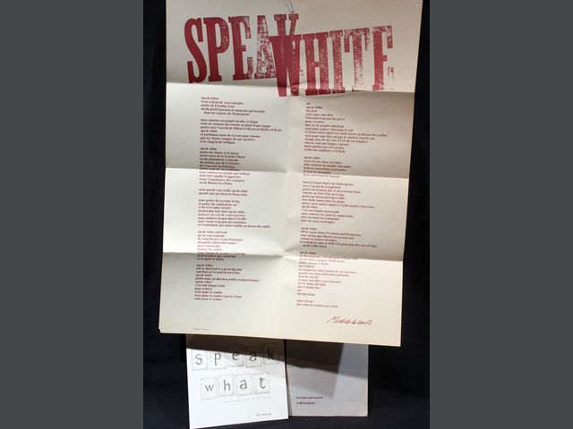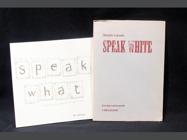 Lot # 143 - POÉSIE 2 opuscules originaux au sujet de la linguistique et du français : - Speak White de Michel Lalonde (Poême engagé de 1968 pour le film de Pierre Falardeau et Julien Poulin, format affiche) - Speak What de Marco Micone suivi d'une analyse de Lise Gauvin, Éditions VLB. SOLD