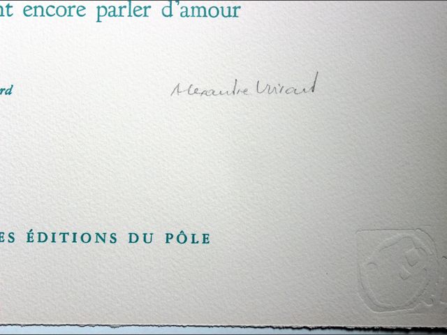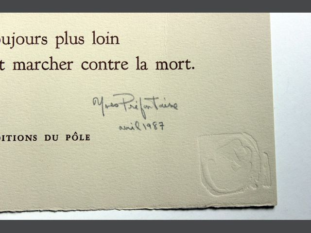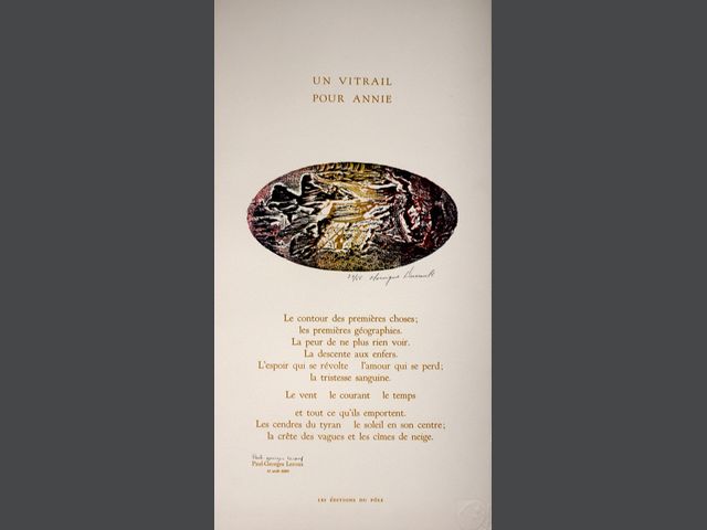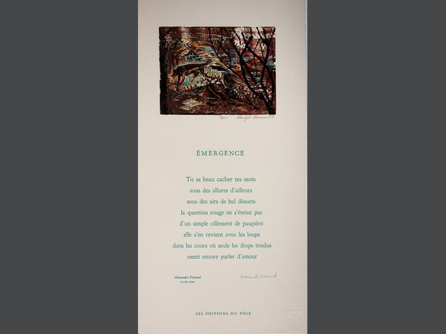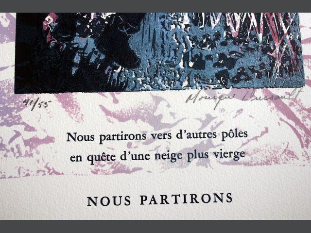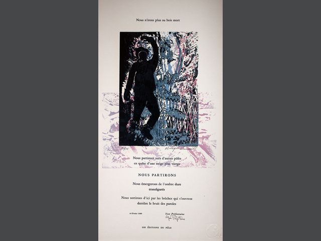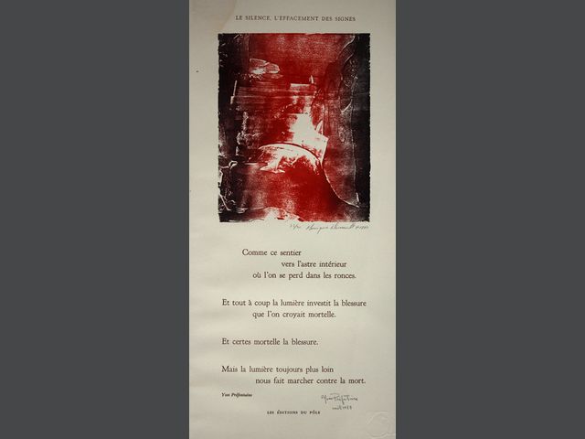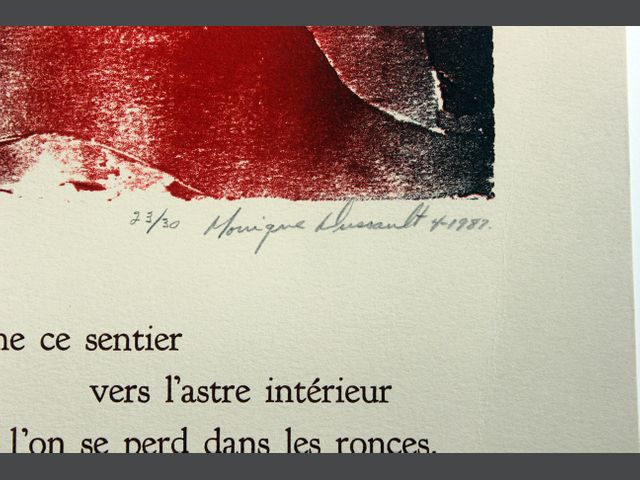 Lot # 55 - Monique DUSSAULT (1943) Ensemble de 4 compositions typographiques avec gravures de l'artiste, toutes signées et numérotées : - Nous n’irons plus au bois mort - Un vitrail pour Annie - Émergence - Le silence l’effacement des signes SOLD