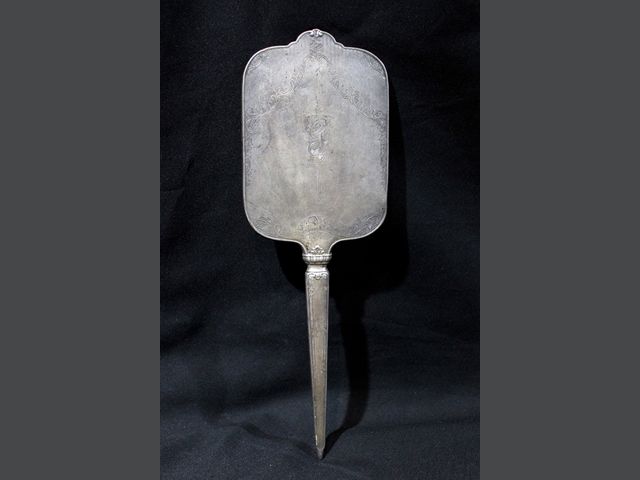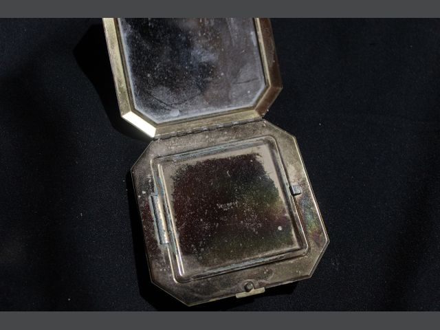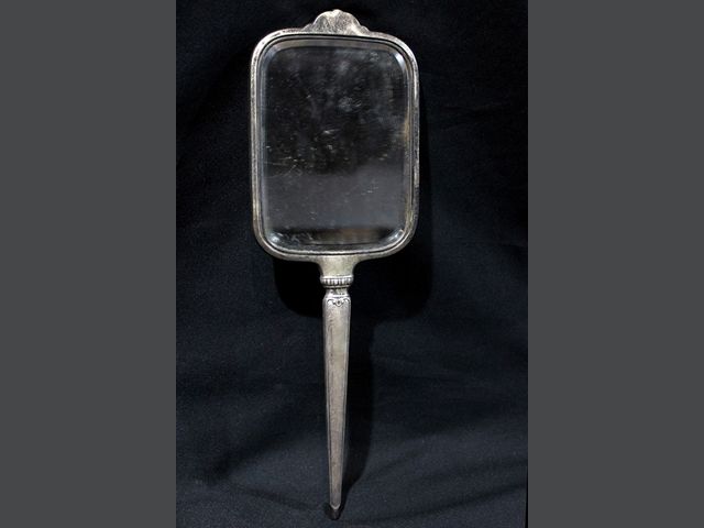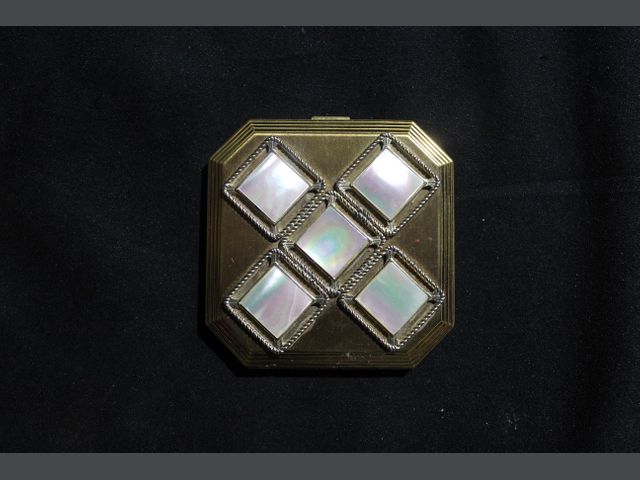 Lot # 63 - ARGENT Face-à-main en argent (poinçon), chiffré au dos. Désargenture, usures. H_36 cm On y joint un poudrier de poche avec son miroir en métal doré orné de carrés nacrés (décolés), gravé VOLUPTÉ U.S.A. à l'intérieur. H_8 cm L_8 cm SOLD