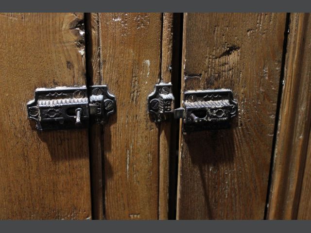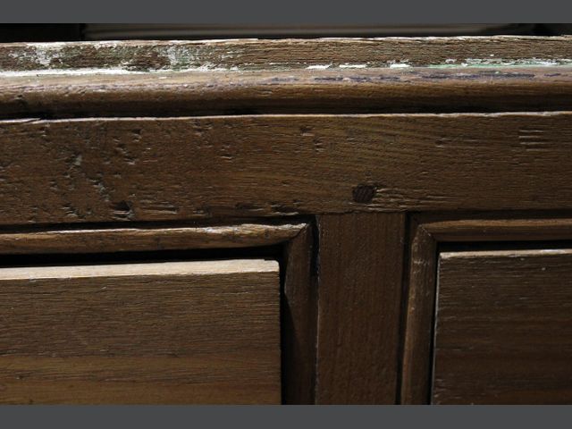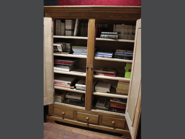 Lot # 105 - QUÉBEC XIXe siècle Armoire ancienne en pin à deux vantaux et 3 tiroirs. Les deux vantaux en façade sont ornés de deux panneaux en creux embouvetés dans un cadre mouluré. Un loquet de fer maintient les vantaux fermés. Les montants du meuble sont assemblées à l'aide de clous carrés. Les parois intérieures et les tablettes sont recouvertes de plusieurs couches de papier peint à motifs géométriques colorés. Travail québécois du début du 19e siècle. H_165 cm L_122 cm P_35 cm SOLD