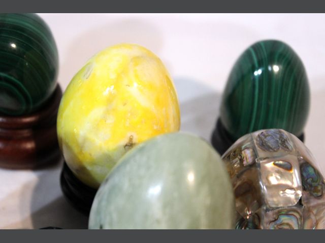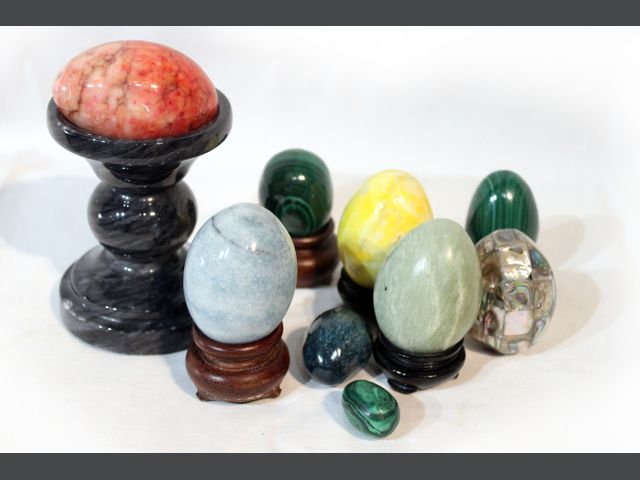 Lot # 14 - Lot d'œufs en pierre dure, tailles diverses. On y joint quelques socles en bois. SOLD