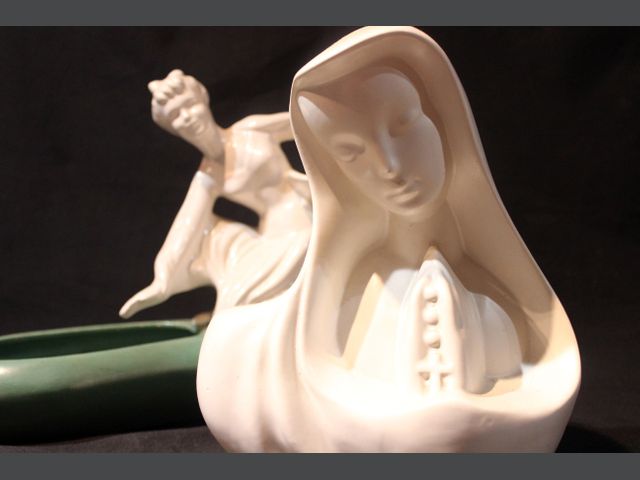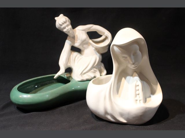 Deux petits bassins en céramique, travail américain du Xxe siècle.  Femme accroupie H_27 cm  L_35 cm Religieuse H_25 cm L_20 cm Petits éclats, égrenures.