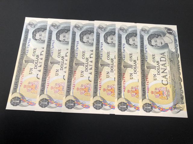 Lot # 256 - 6 Billets de $1 de 1973 avec Astérisque ''AA'' avec numéros consécutifs neufs et incirculés 'rare' SOLD