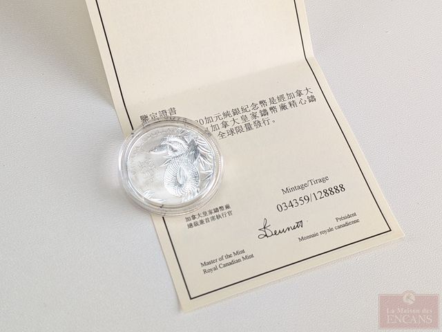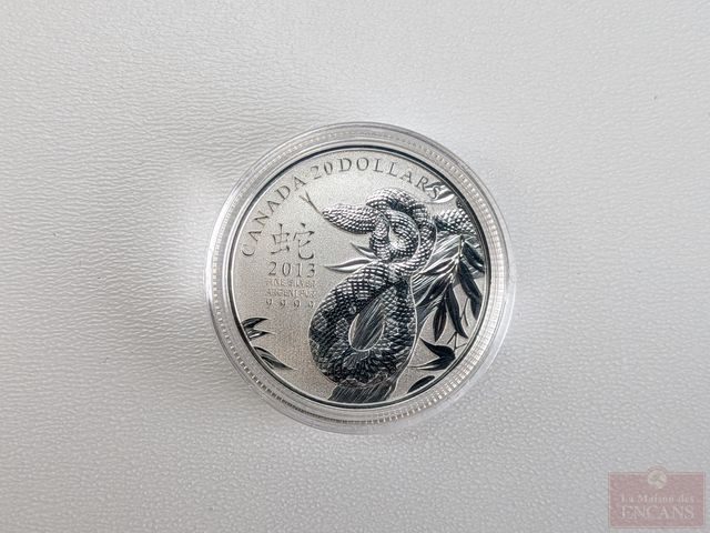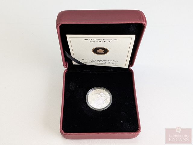 Lot # 80 - Pièce canadienne de vingt dollars 2013 Année du serpent un-quart d'once d'argent pur 9999, encapsulée, dans son coffret avec certificat, sans taxes