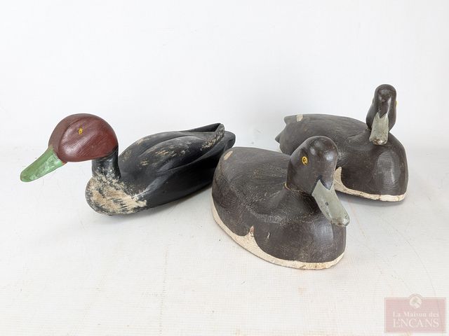 Trois appelants sculptés sur bois et peints à la main, le plus grand mesurant 15 pouces de longueur