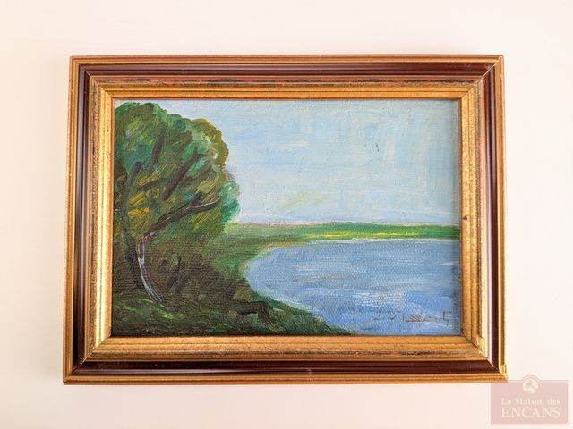 Lot # 77 - J.O. LEAGAULT (peintre de la Montée Saint-Michel) - Huile sur panneau signée, mesurant 5.5x8 pouces et titrée Bord du lac Saint-Louis