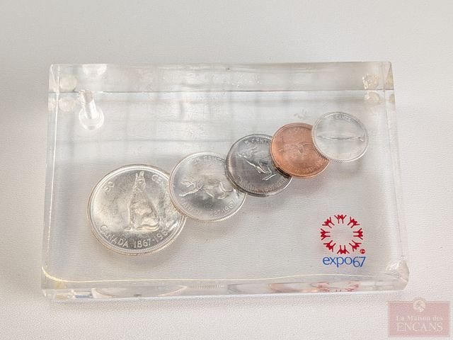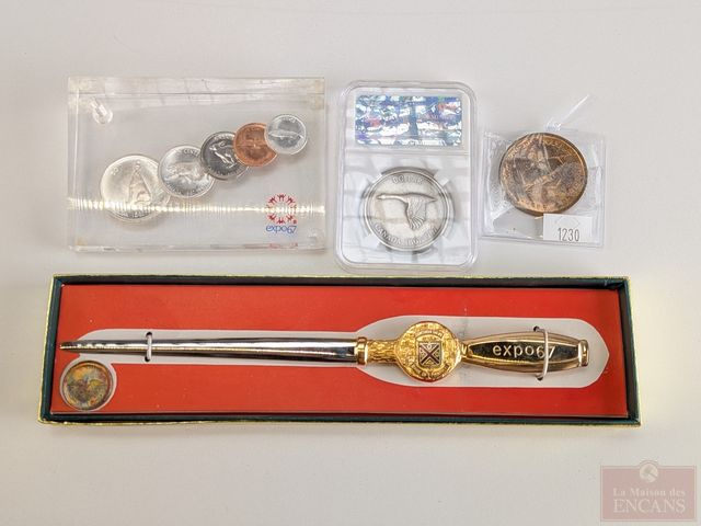 Lot # 115 - Lot varié de l'Expo 67 comprenant ouvre-lettre, pièces en argent, jeton commémoratif et dollar en argent
