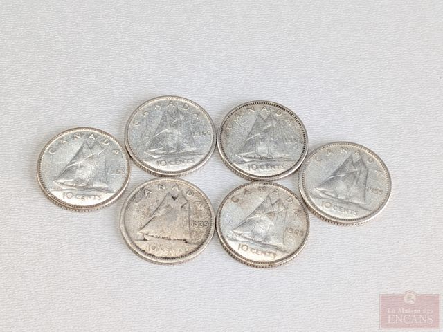 Lot de pièces canadiennes de dix sous en argent, comprenant 1939, 1955, 1962, 1966 et 1968 x2