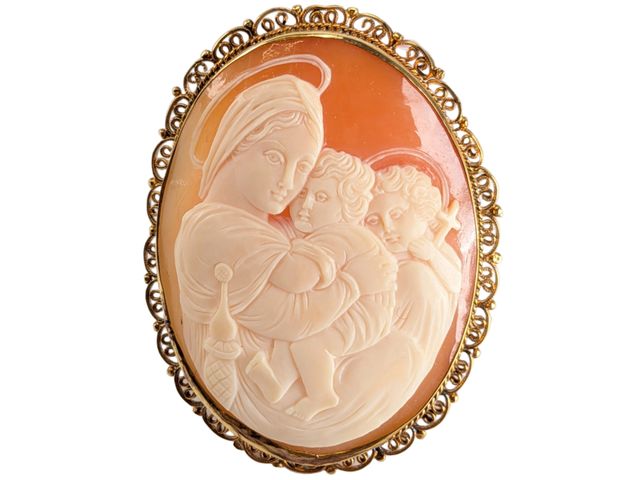 Superbe camée sculpté sur coquillage, sculpté d'après l'oeuvre de Raphaël La vierge à la chaise, monté en broche en argent plaqué or (vermeil) et mesurant 2 pouces de hauteur