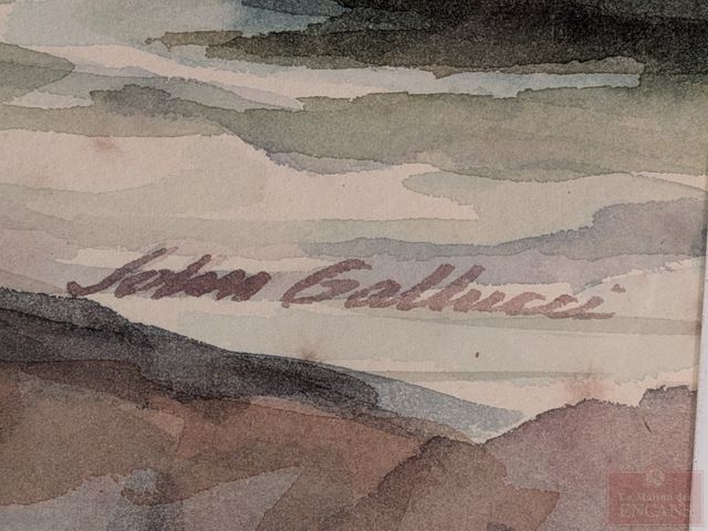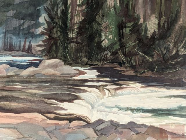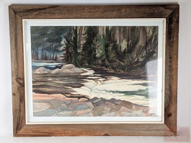 Lot # 53 - John GALLUCCI (1918-2009, artiste connu pour avoir illustré et peint les affiches des Jeux Olympiques de Lake Placid en 1980) - Aquarelle originale par le célèbre artiste impressionniste américain, signée, représentant un paysage des Adirondacks, forêt de montagne et ruisseau, l'œuvre mesurant 21x29 pouces et son cadre en bois mesurant 38x30 pouces