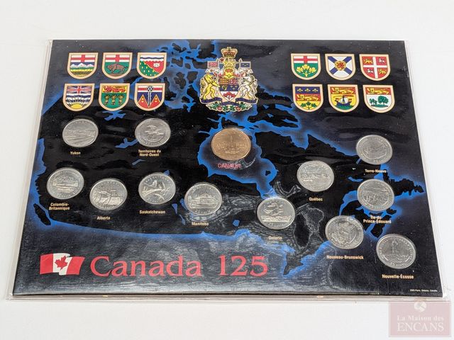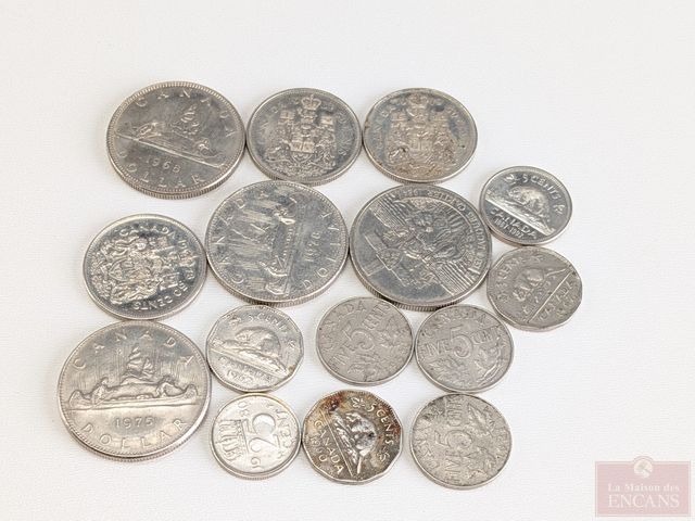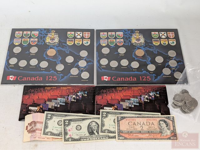 Lot # 79 - Lot numismatique canadien et américain comprenant deux ensembles des provinces canadiennes 1992, deux ensembles Cent ans du cinéma au Canada 1996, billets d'un et deux dollars 1954, 1973 et 1986, timbres, pièces de monnaie, ainsi que trois billets de deux dollars américains 1976