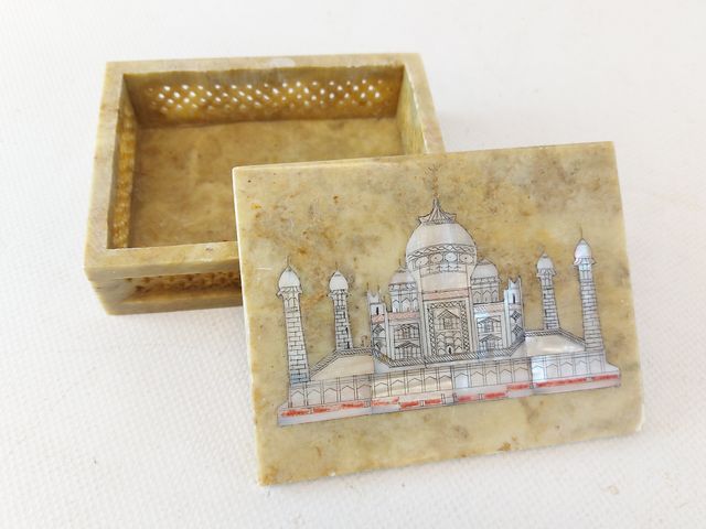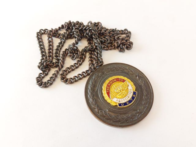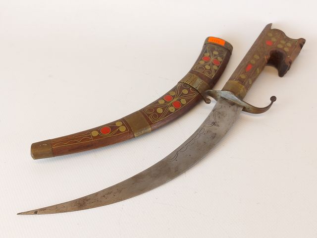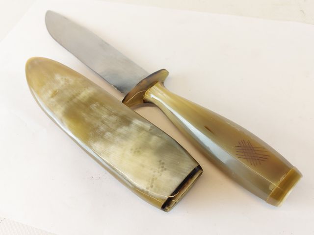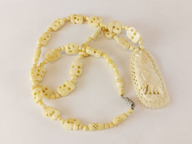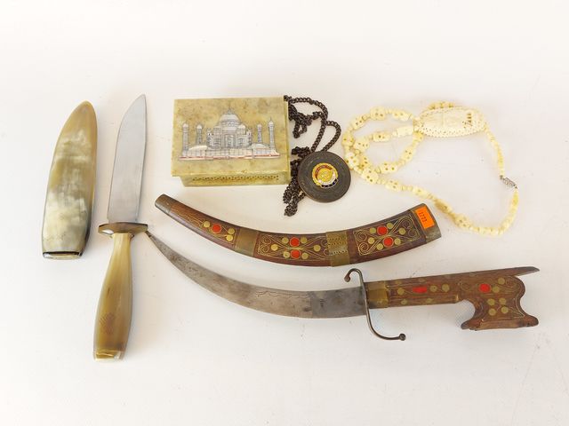 Lot # 168 - Lot varié comprenant deux couteaux - dont un avec un étui en corne de boeuf - un collier sculpté sur os - une petite boite et une médaille commémorative  SOLD