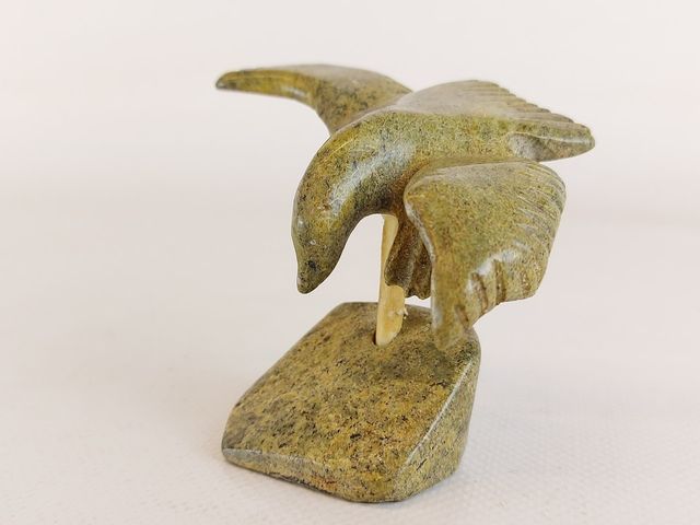 Exceptionnelle sculpture esquimaude signée et sculptée dans une superbe pierre verte à multiples tons de vert - représentant un aigle en vol - en excellente condition - mesurant 4x3 pouces - chef d'œuvre de l'art esquimau