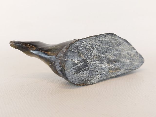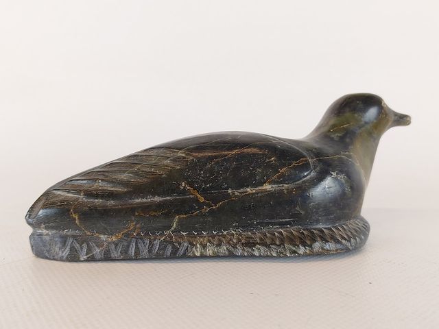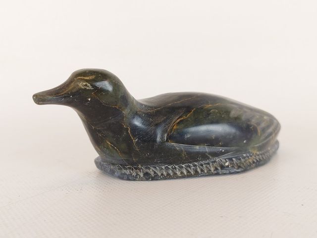Lot # 71 - Magnifique huard sculpté dans une pierre verte veinée introuvable de nos jours - signé en esquimau - mesurant 6.75 pouces de longueur - en excellente condition - acquis par le collectionneur lors de la fermeture d'un musée en Ontario   SOLD