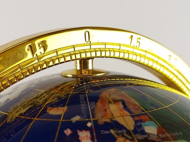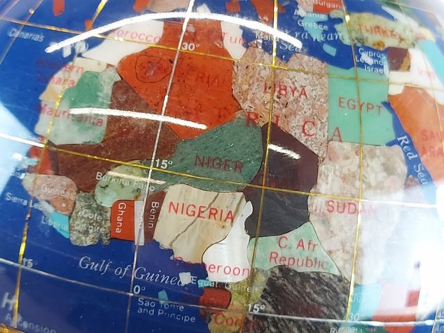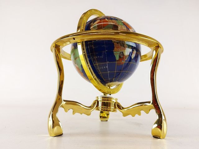 Lot # 37 - Joli globe terrestre avec incrustation de pierres variées et son support en métal - mesurant 9 pouces de hauteur SOLD