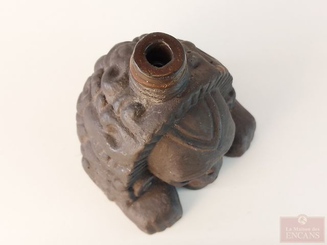 Lot # 213 - Sifflet aztèque reproduisant un cri de détresse, sculpté sur pierre volcanique. Était utilisé à l'époque par les guerriers pour effrayer leur adversaires. Mesurant 3.5 pouces de hauteur SOLD