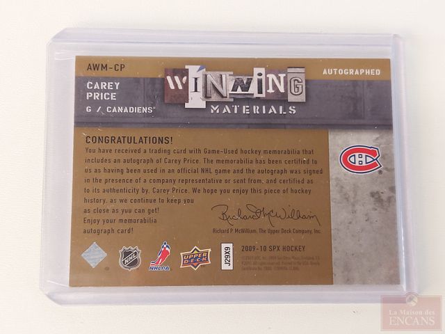 Lot # 226 - Carte de hockey Upper Deck autographiée Carrey Price winning materials numéroté sur 50 avec deux morceaux de chandail ''game used'' SOLD
