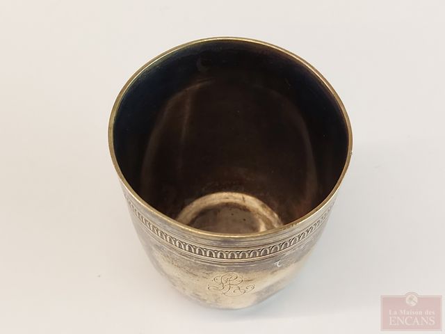 Lot # 114 - Ancien gobelet de jeu en métal argenté avec initiales - datant du 19em siècle - mesurant 3 pouces de hauteur VENDU