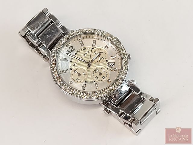Montre Michael Kors chronographe au quartz, mesurant 42 millimètres avec sa couronne, avec mailles supplémentaires et papiers dans sa boite (fonctionnelle mais besoin d'une nouvelle batterie)
