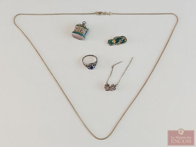 Lot de bijoux en argent, comprenant collier, boutons de machettes, pendentifs et bague, le collier mesurant 23 pouces de longueur