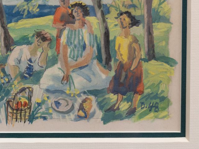 Lot # 81 - Aquarelle initialée Jean-Philippe Dallaire et datée 1948 6 X 11 Pique-nique (Provenance Galerie 67) CANCELLED