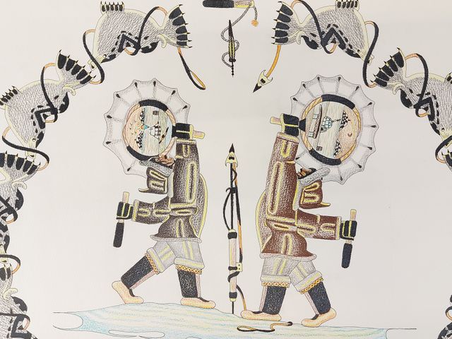 Rarissime dessin à cause de ses dimensions hors du commun pour cet artiste - mesurant 30x22 pouces - de très nombreux détails finement exécuté par l'artiste de très grande renommée Peter Ragee du Cap Dorset et représentant deux joueurs de tambour dansant au centre - on distingue des scènes arctiques - au milieu est planté sur la banquise un magnifique harpon - le tout encerclé d'une farandole de phoques - avec son sceau d'authenticité le Ulu - signé deux fois dont une fois en inuit - en excellente condition - chef d'œuvre et dernier dessin de Peter Ragee de la collection privée d'un grand collectionneur