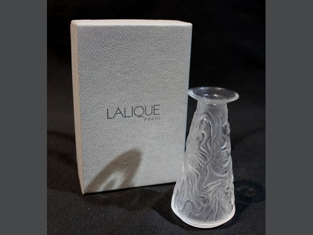 Lot # 41 - LALIQUE France VASE soliflore en cristal moulé pressé satiné mat et brillant translucide à décor de sirènes. Épreuve signée, neuf dans sa boîte. H_10 cm