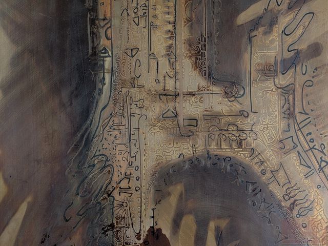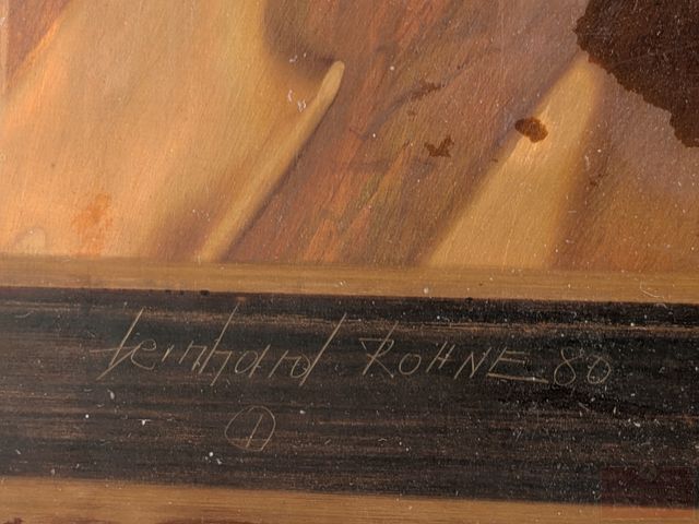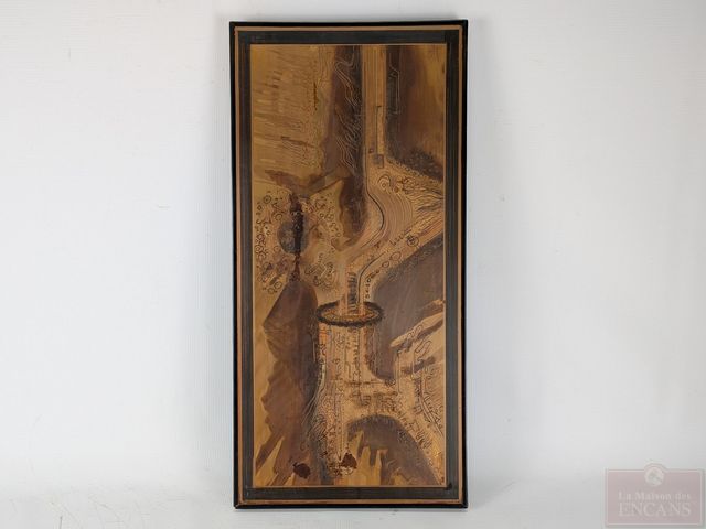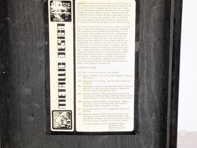 Lot # 54 - Bernhard E. ROHNE (artiste allemand né en 1944) - Gravure sur plaque de métal oxydée, signée, datée 1980 et mesurant 24x11 pouces, avec document biographique à l'endos