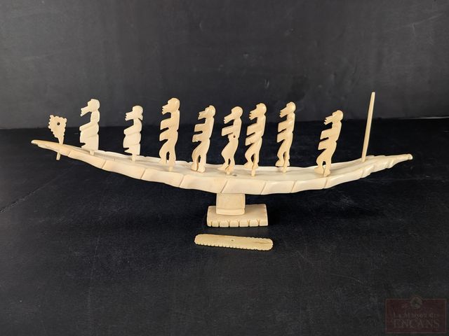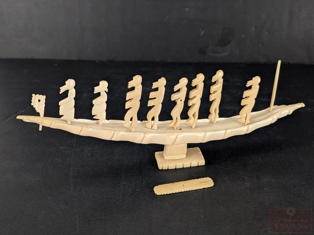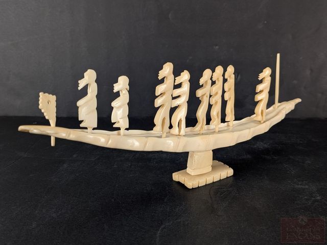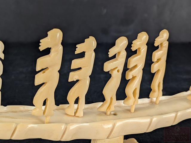 Lot # 94 - Barque cérémoniale et personnages sculpté sur ivoire - mesurant 10.5 pouces de long - les personnages mesurant environ 1.5 pouces - circa 1940