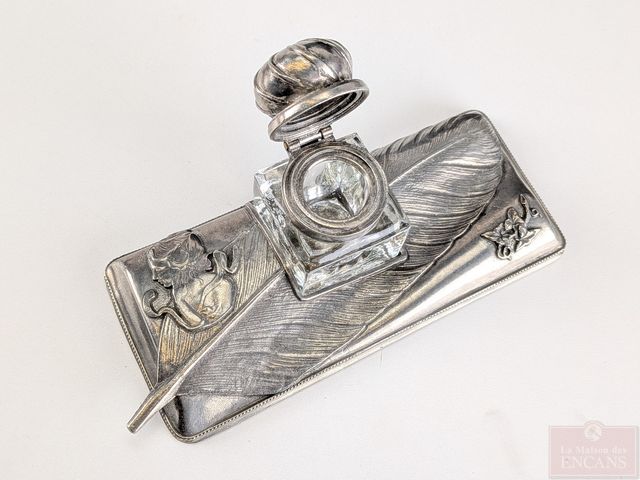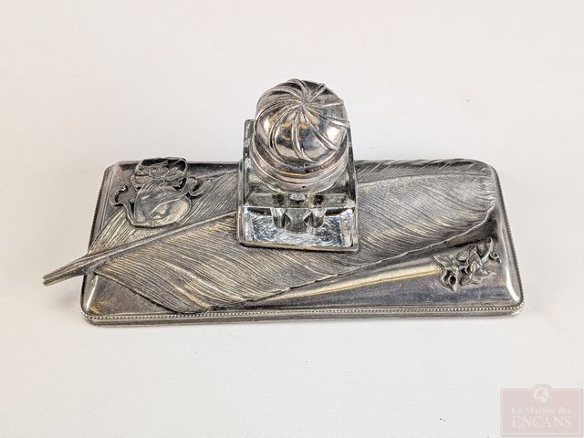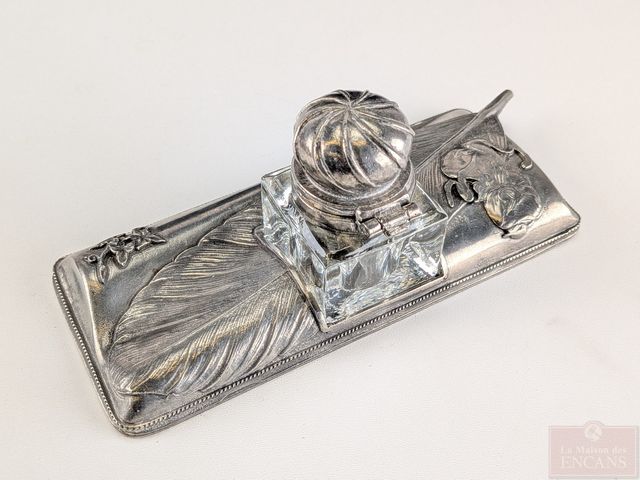 Encrier français en étain avec sa bouteille de verre, mesurant 6 pouces de largeur