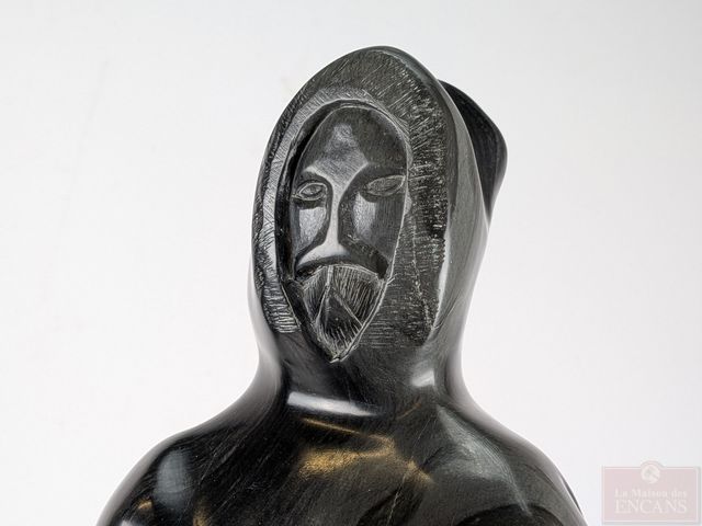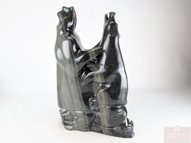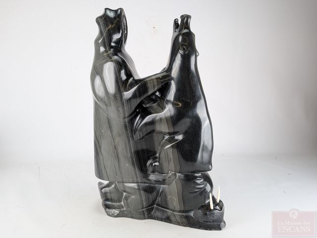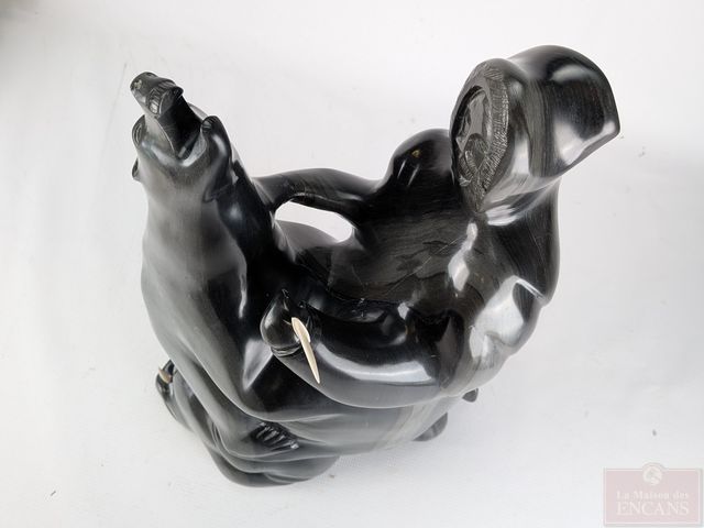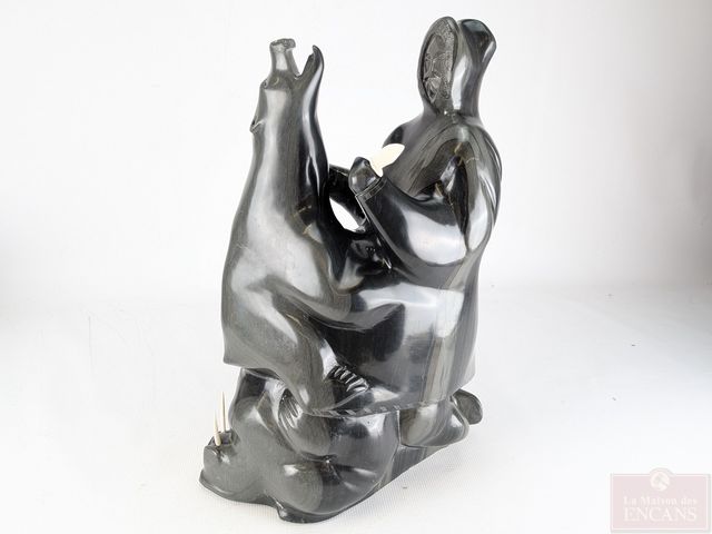 Lot # 32 - Superbe sculpture inuite sur pierre à savon, signée, représentant un chasseur et un ours se disputant le résultat de la chasse au morse et mesurant 19 pouces de hauteur